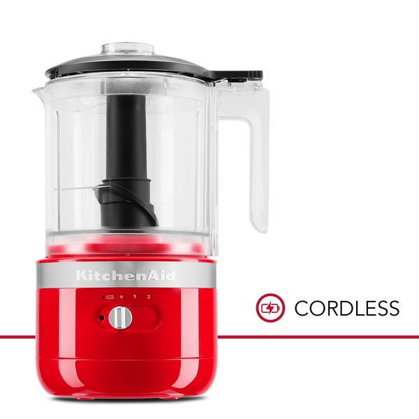 All the Power You Expect, without the Cord. Go where ambition takes you with the Cordless Food Chopper from KitchenAid. Designed with a powerful rechargeable Lithium Ion Battery, the new cordless food chopper delivers optimal run time and performance, so you can cook wherever*, whatever, and however you choose. Chop up to 40 onions on a full charge** *Indoor use only. **Based on onion size of 90 - 110 grams