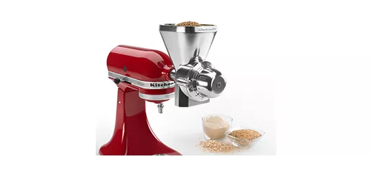 All Metal Grain MillWith freshly-milled grains or flour you can easily add a hearty taste and texture to your delicious baked goods. The all-metal KitchenAid® Grain Mill Attachment attaches directly to the power hub of any household KitchenAid® Stand Mixer* to grind wheat, oats, corn, rice, and other low-moisture, low-oil grains. And this attachment provides the versatility you need with a variety of grind levels to choose from - easily go from 'cracked' to extra-fine consistency. Use the provided cleaning brush as you transition between different grains and after each use. *sold separately.