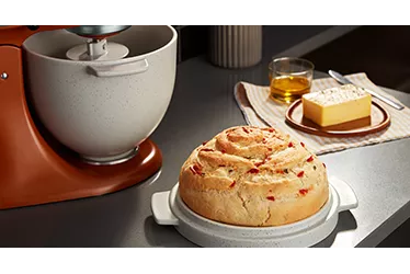 Bread Bowl with Baking LidBake Craft-Quality bread at home in 4 easy steps (mix, knead, proof and bake) with the KitchenAid® Bread Bowl with Baking Lid. The bowl pairs seamlessly with all KitchenAid® 4.5 and 5 Quart Tilt-Head Stand Mixers*, and features a lid that traps steam when baking to create an environment similar to a traditional steam oven. The ceramic mixing bowl retains and delivers even heat throughout the baking process, giving your bread a crispy crust and thorough bake. Imagine the possibilities. Traditional white, chocolate rye, brioche and more, you can make them all at home with the KitchenAid Bread Bowl with Baking Lid. *sold separately.