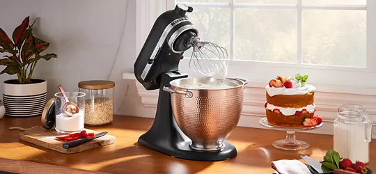 5 Quart Hammered Copper BowlAccessorize your KitchenAid® Tilt-Head Stand Mixer* with this 5 Quart Hammered Copper Bowl, for all of your mixing, whipping and kneading tasks. This beautiful bowl was crafted to patina over time, reflecting your growth as a Maker. The bowl features a food-safe stainless steel interior. Designed to fit all 4.5- and 5-quart KitchenAid® Tilt-Head Stand Mixers - sold separately.