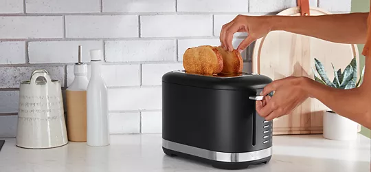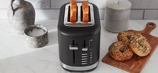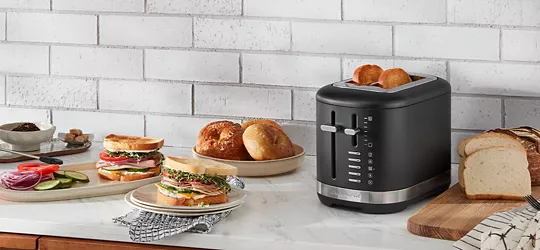 2 Slice ToasterMake everyday simply delicious and easily toast your favorite breads, bagels and more with ease. This KitchenAid® 2 Slice Toaster features extra-wide slots to toast a variety of shapes and sizes, including homemade or craft breads. For added convenience the adjustable shade control, from light to dark, ensures you'll have your toast just the way you like it, every time. It's built to last and the durable metal design adds style to your countertop.