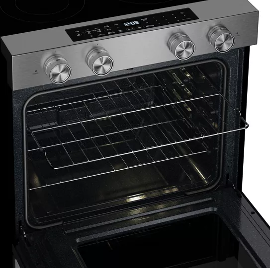 keep your oven clean with two distinct cycles. The Steam Clean Cycle, perfect for quick, routine maintenance, helps loosen cooked-on food in under an hour. Simply add water to the bottom of the oven and wipe down after the cycle. For a deeper clean, the high-temperature Self-Clean Cycle powers through baked-on spills, leaving the oven cavity clean with just a final wipe-down.