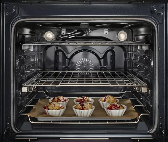 Features a unique bow-tie design with heating element and fan that circulates hot air throughout the entire oven, providing optimal temperatures combined with airflow for crisp, flaky baked goods, juicy, well-browned roasts and caramelized vegetables.