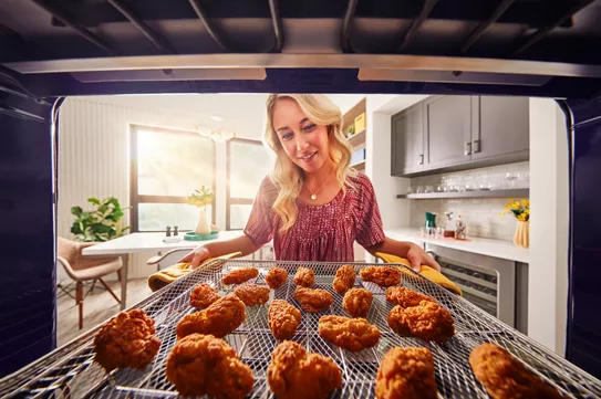 Features a unique bow-tie design with heating element and fan that circulates hot air throughout the entire oven, providing optimal temperatures for delicious baked goods, juicy roasts and flavorful vegetables.