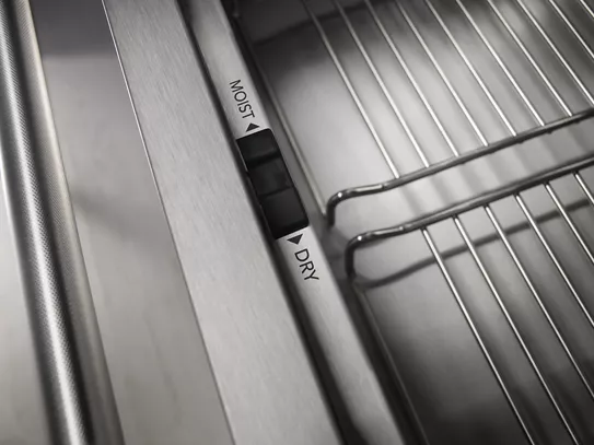 adjusts moisture levels in the drawer to help retain the flavor and texture of different foods. The Dry Setting lets steam escape, great for baked goods and fried foods. The Moist Setting seals in moisture, great for egg dishes, roasts and vegetables.