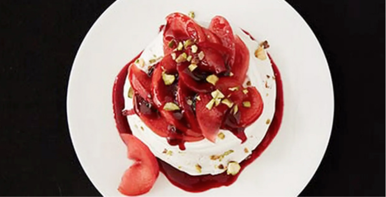 Hibiscus Poached Apples Atop Pistachio Clouds