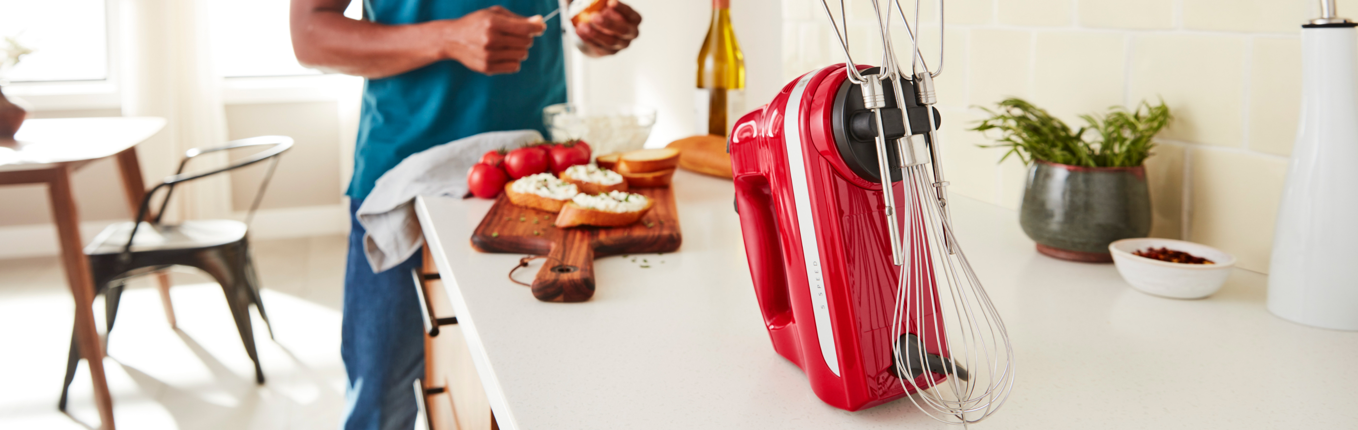 Nothing beats a hand mixer for common kitchen tasks. KitchenAid brand offers multiple mixers in a variety of speeds to help with whipping, mixing, kneading and more. With different attachments to choose from, your KitchenAid® hand mixer can become a trusted partner in your next making adventure.