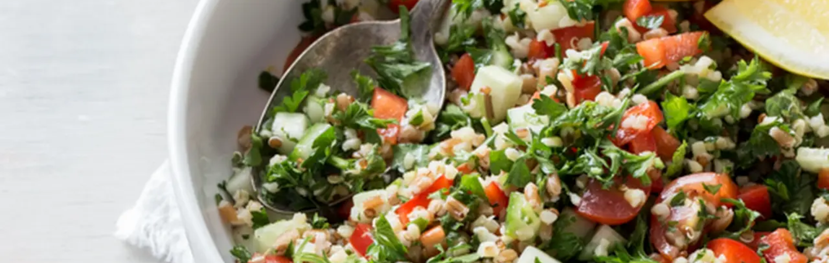 A dish at the very heart of Middle Eastern cooking, tabouli (sometimes tabbouleh) is a salad made from bulgur instead of leafy greens. The combination of the bulgur, vegetables and herbs (especially parsley) makes tabouli a nutrient-rich meal and a light, refreshing alternative to a common salad.