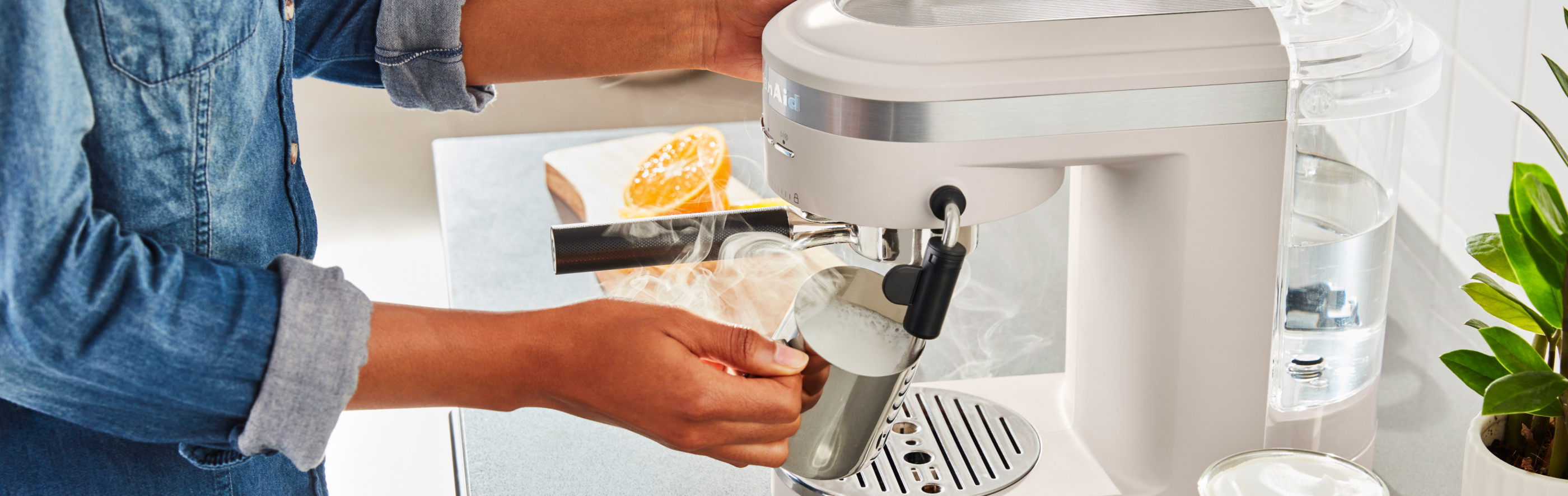 Create rich and creamy cafe favorites in your own kitchen with a milk frother. Shop KitchenAid® espresso machines with a steam wand to hand craft lattes, macchiatos, mochas and more. Or create light and silky milk foam at the touch of a button with the KitchenAid® Automatic Milk Frother Attachment. Looking for other coffee tools? Shop the entire coffee collection to find whatever you need for your perfect cup from grinders to cold brew coffee machines, or explore gifts for the coffee and tea lovers in your life.