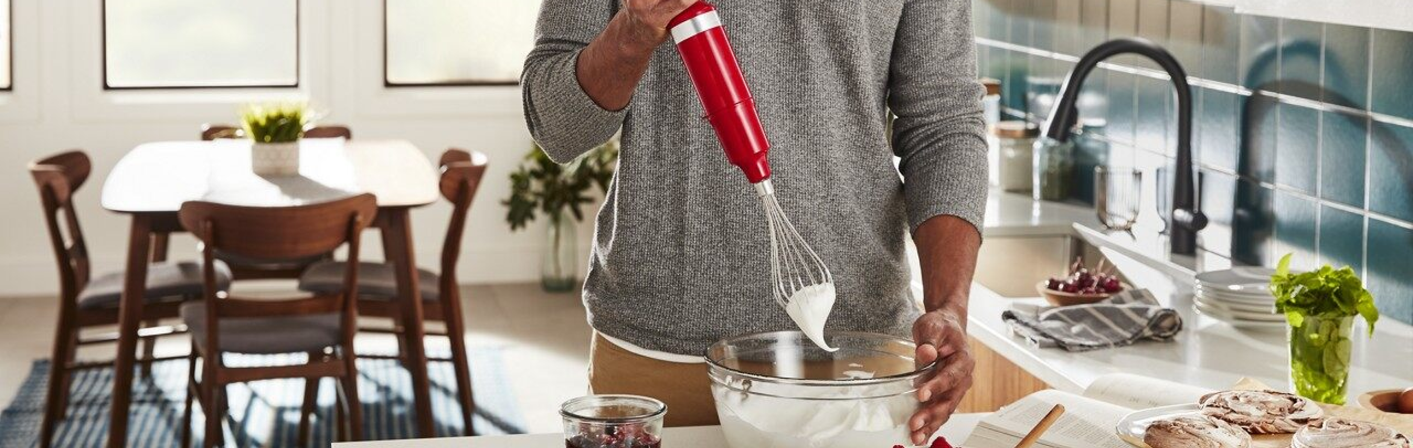 Some immersion blenders work with a whisk accessory to help with tasks that require aerating or mixing ingredients. The KitchenAid® Cordless Variable Speed Hand Blender is compatible with attachments including a whisk to quickly whip egg whites or heavy cream to fluffy peaks, or emulsify vinaigrettes, sauces or other toppings. If you want to hone your technique, learn how to separate egg whites with this guide.