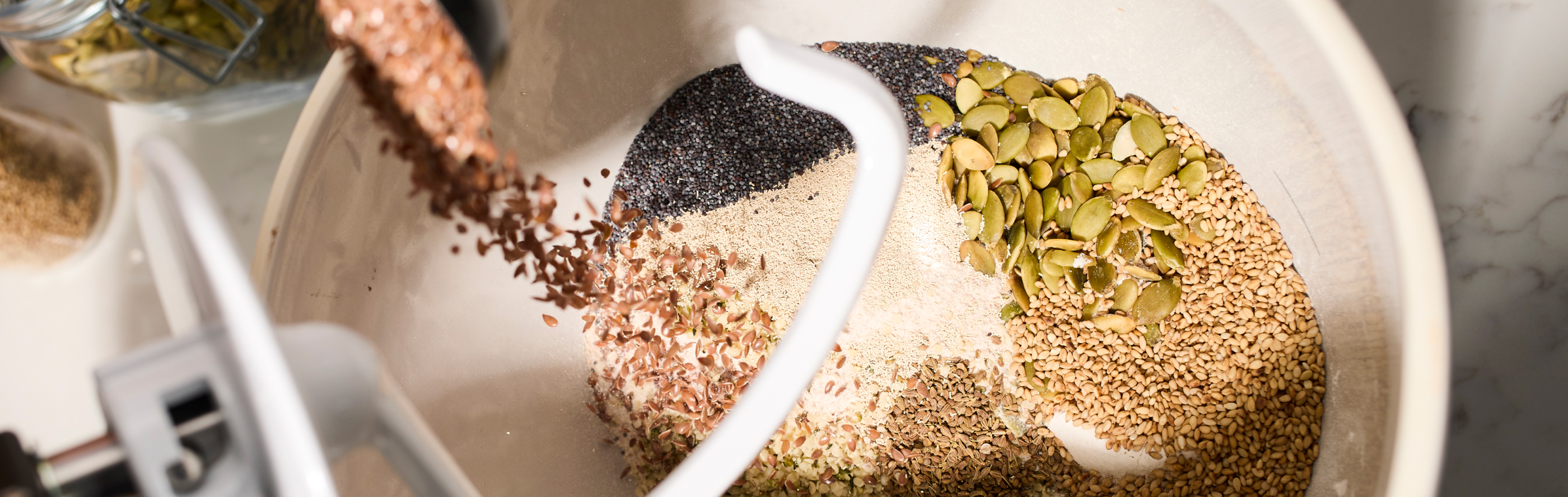 KitchenAid® countertop appliances can help you incorporate new ingredients into your meals. KitchenAid® food processors and blenders can help you process grains for everything from oat milk to rice flour. Mix and knead whole grain bread in a stand mixer bowl or create homemade soba noodles with a pasta attachment.1