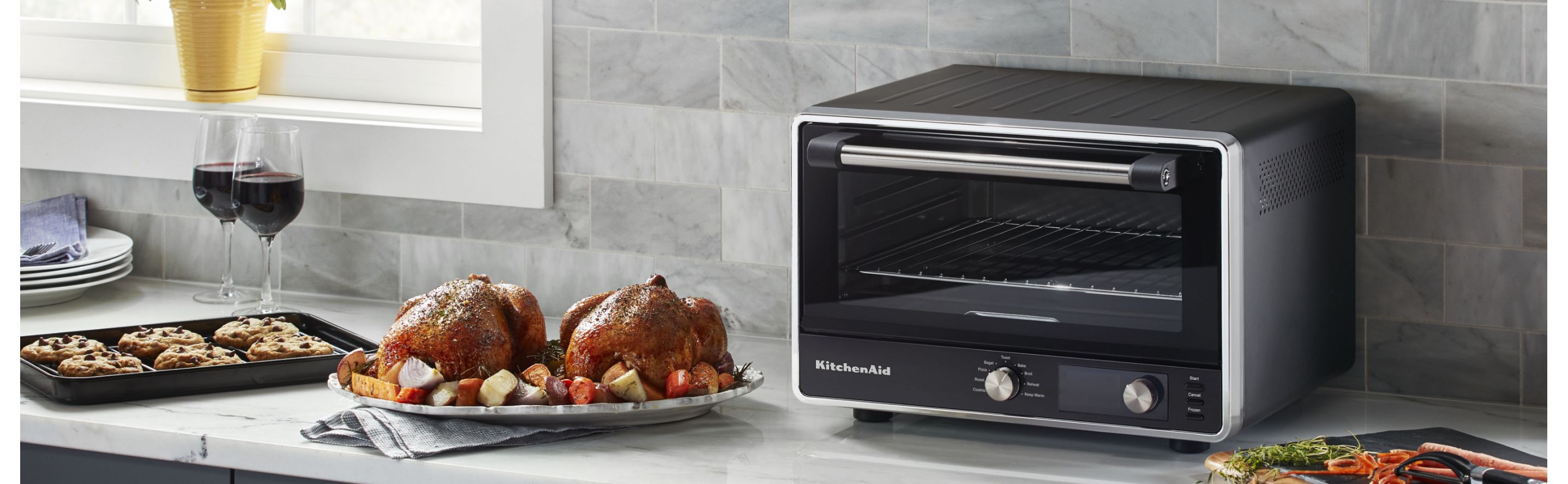 KitchenAid brand offers full-sized oven expertise on your countertop with a lineup of innovative, space-saving countertop ovens. Choose from three models with enough capacity to fit a 9x13 baking pan, perfect for a sheet cake, a full one-pan dinner or up to 2 full size chickens (3.4 lbs each). Discover select convection countertop ovens to get delicious, even results on a range of recipes. Browse the selection to find the right fit for your countertop, including models that let you experiment with new techniques like air frying, dehydration for making jerky and dough proofing. Consider also learning about KitchenAid® smart ovens. Looking for countertop oven accessories or countertop oven replacement parts for your KitchenAid® Countertop Oven? Shop all of our countertop oven accessories.