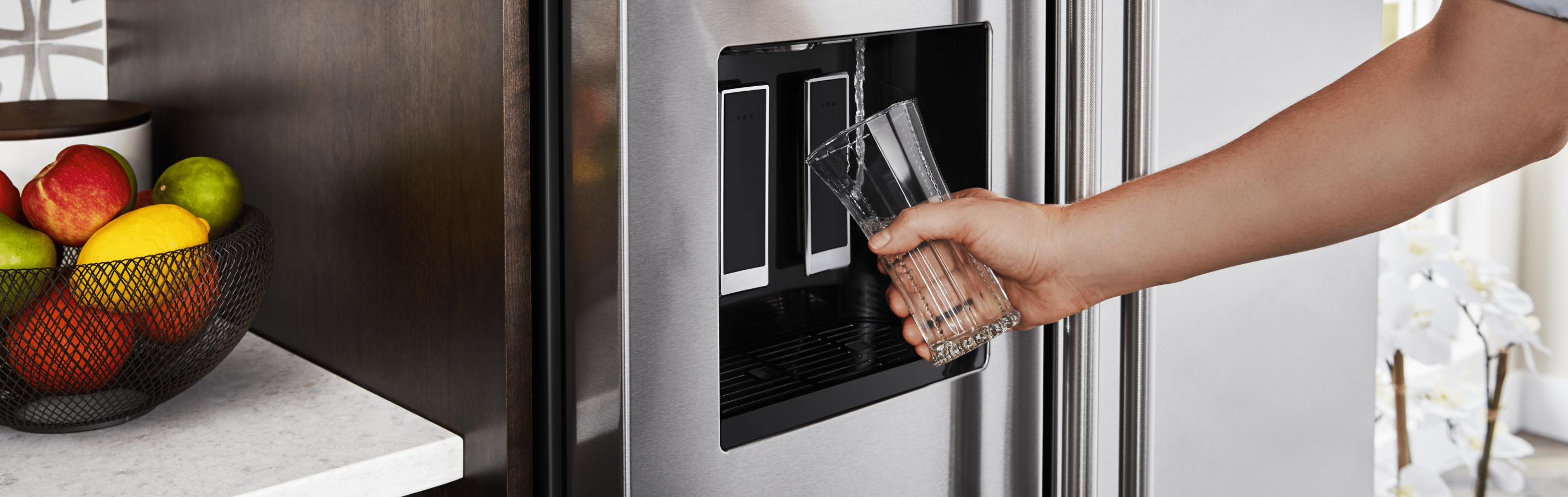 The model and location of a refrigerator water filter can vary depending on the brand of your appliance, but the basic steps to replace it are usually the same. When your refrigerator water filter needs to be replaced, you may notice a change of taste in both the water and the ice maker. In select KitchenAid® models, your refrigerator will signal that it’s time to replace the filter with an indicator light on the fridge’s control panel. Learning how to replace a water filter in your fridge will help to keep your water tasting crisp and refreshing. Select KitchenAid® built-in, French door and side-by-side refrigerators offer water dispensers with filters that keep your water tasting fresh with proper maintenance.