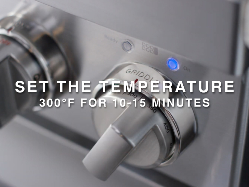 If the griddle has already cooled down when it’s time to clean it, set the temperature to 300ºF and wait 10-15 minutes. The temperature for cleaning may vary by model, so check your owner’s manual for specific information. If your griddle does not have temperature control, turn it on low heat for 10-15 minutes prior to cleaning.