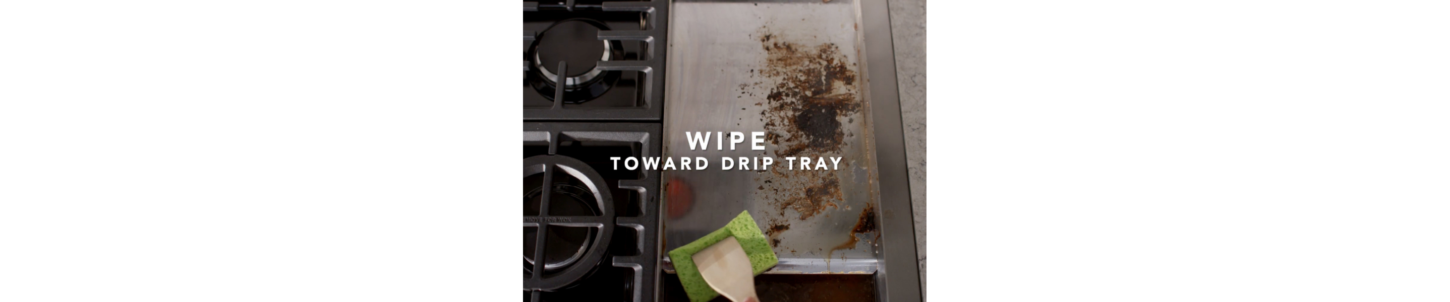 Use a pad holder or wooden spatula with the non-scratch pad or sponge to clean the soiled area, moving the residue and water to the drip tray at the front. It will be necessary to apply pressure on heavily soiled areas. For stubborn soils, it may be necessary to repeat this process until all residue is removed.