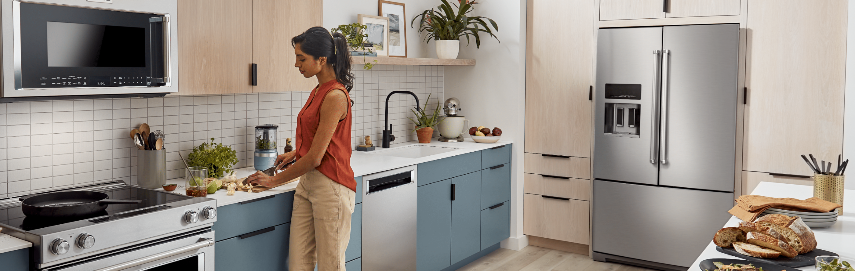 If you’re able to tuck a refrigerator into a corner or against a wall, that could be an efficient use of space. An undercounter fridge is another option for small kitchens if you have no need for a freezer or can put one in a garage or basement. If you can’t manage a full-sized refrigerator, there are small space fridges designed with tight spaces in mind. For more inspiration, get some small kitchen remodeling tips and browse KitchenAid® undercounter fridges and freezers.