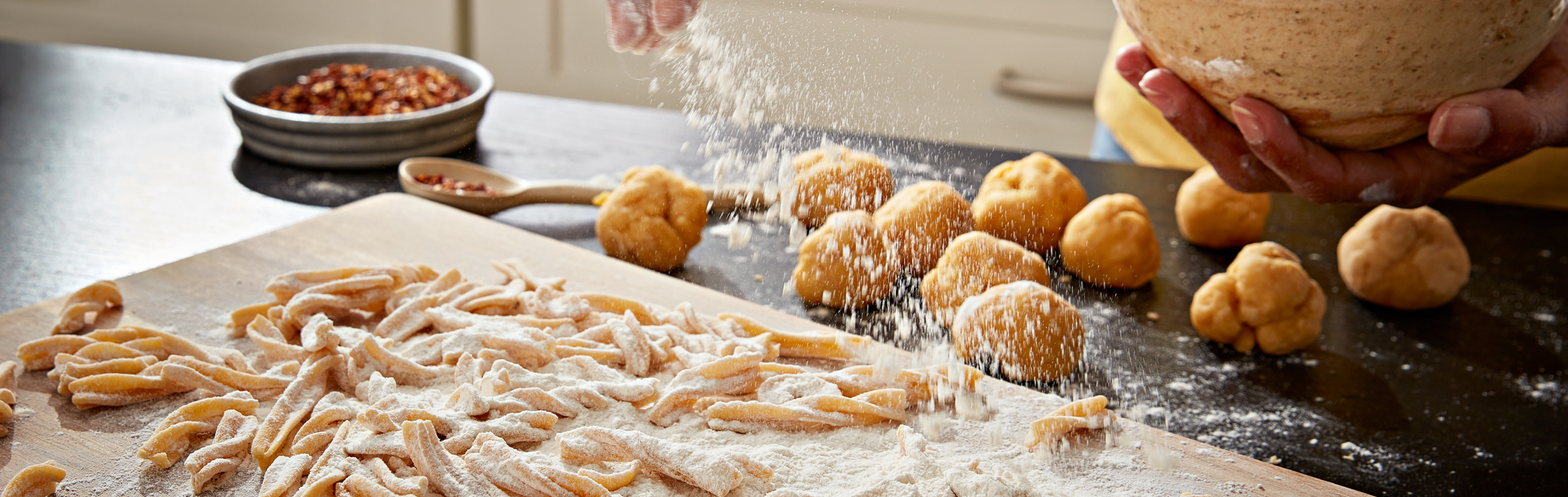 FLOUR TIP: A variety of flours can be used. All-purpose, semolina or 00 flour are all popular choices. 00 flour is a super-fine flour with a low protein level that produces a silky pasta. Semolina flour is made from hard durum wheat and is often used for larger, heartier pastas. All-purpose flour may require a little extra kneading time to activate the gluten. Discover more about 13 types of flour and their ideal uses for pasta and a variety of baked goods.