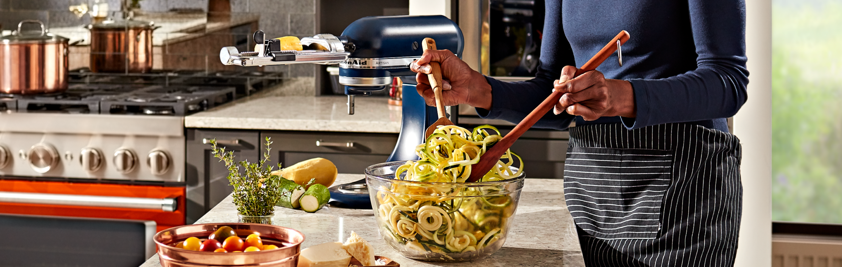 Colorful, flavorful, fresh – spiralized vegetables are a delicious way to incorporate healthy ingredients into your cooking. When you add a KitchenAid® attachment or accessory to any KitchenAid® stand mixer, you’ll find a world of fresh inspiration including veggie noodles, fruit spirals and new takes on classic favorites.