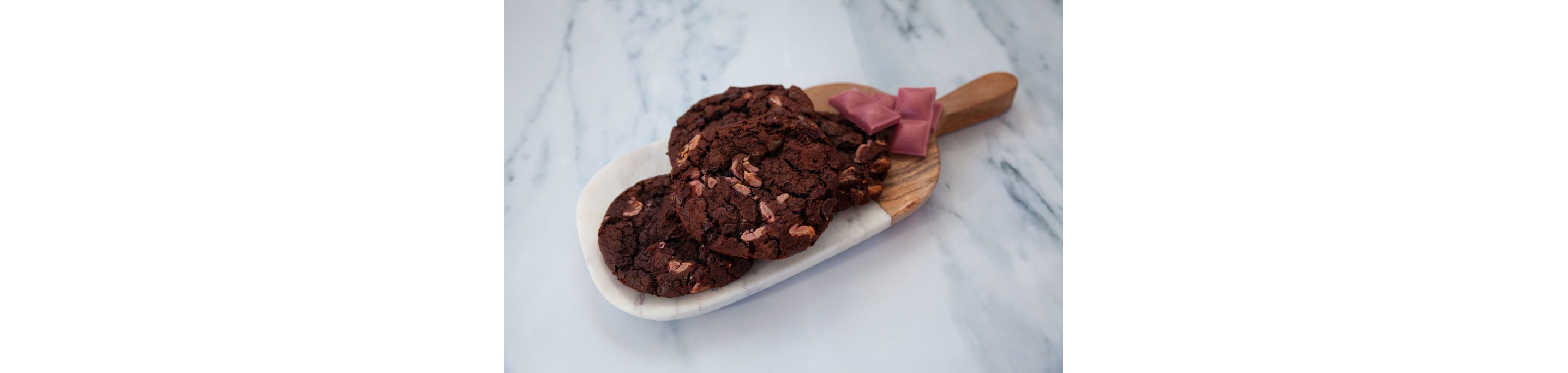 Niedermyer has over 25 years of experience baking under his belt and two years ago he brought his expertise and creativity to Famous 4th Street Cookie. He and the team work together to develop new and exciting cookies and this year they’ve added ruby chocolate to the mix with their Ruby Chocolate Cherry cookie. Compared to white chocolate, Niedermyer says ruby chocolate is a little bit on the sweeter side, but its natural acidity balances that sweetness, which makes pairing this chocolate with tart cherries a delightful flavor combination. “With ruby chocolate, you can do everything from candy making to decorative work to baking,” says Niedermyer, “so I knew it would be a great offering for Famous 4th Street Cookie.”